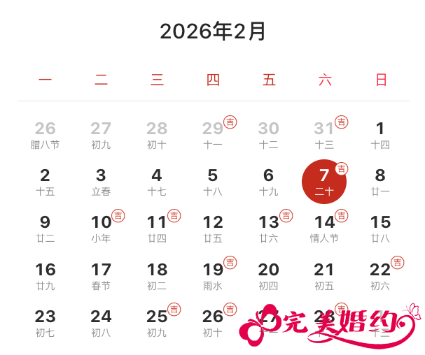 2026年2月结婚吉日共10天,分别是7日、10日、11日、13日、14日、19日、22日、25日、26日、28日。