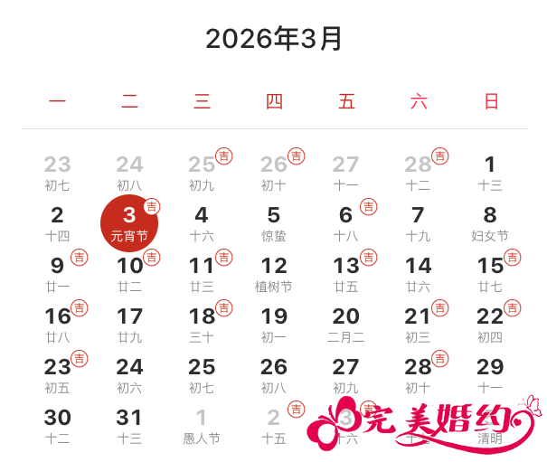 2026年3月结婚吉日共13天,分别是3日、6日、9日、10日、11日、13日、15日、16日、18日、21日、22日、23日、28日。