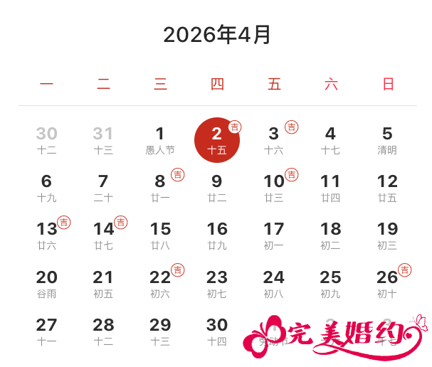 2026年4月结婚吉日有8天,分别是2日、3日、8日、10日、13日、14日、22日、26日。