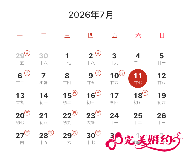 2026年7月结婚吉日共有14天,分别是2日、6日、9日、10日、15日、16日、18日、20日、22日、23日、27日、28日、29日、30日。