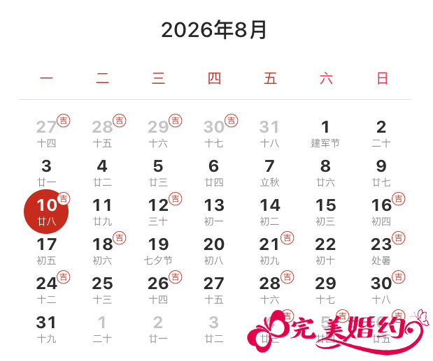 2026年8月结婚吉日共10天,分别是10日、12日、16日、18日、21日、23日、24日、26日、28日、30日。