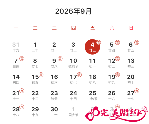 2026年9月结婚吉日共有12天,分别是4日、5日、6日、7日、9日、12日、15日、17日、19日、21日、27日、28日。