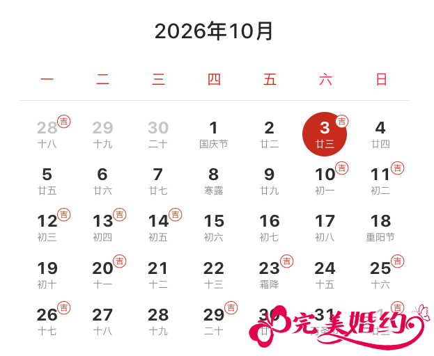 2026年10月结婚吉日共11天,分别是3日(国庆假期)、10日、11日、12日、13日、14日、20日、23日、25日、26日、29日。
