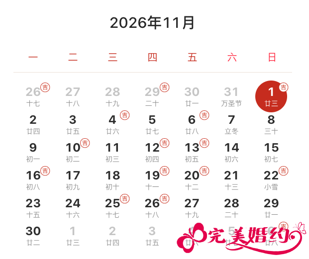 2026年11月结婚吉日共12天,分别是1日、4日、6日、10日、12日、13日、16日、19日、20日、22日、25日、26日。