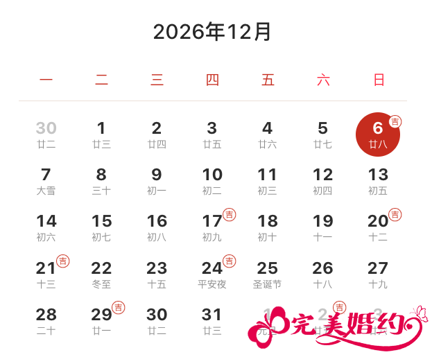2026年12月结婚吉日共有6天,分别是6日、17日、20日、21日、24日、29日。